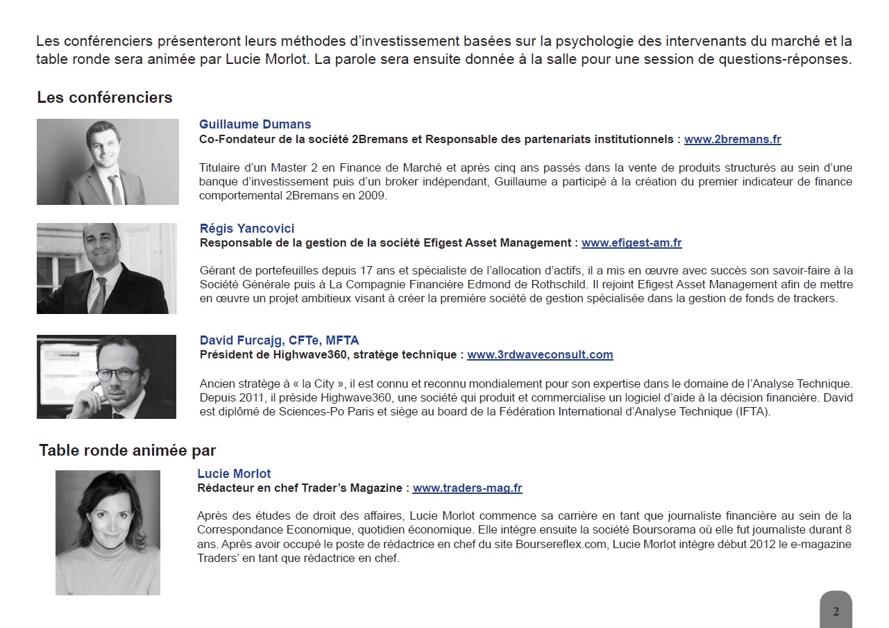 Guillaume Dumans: Co-Fondateur de la société 2Bremans et Responsable des partenariats institutionnels : http://2Bremans.fr , titulaire d'un Master 2 en Finance de Marché et après cinq ans passés dans la vente de produits structurés au sein d'une banque d'investissement puis d'un broker indépendant, Guillaume a participé à la création du premier indicateur de finance comportemental 2Bremans en 2009.