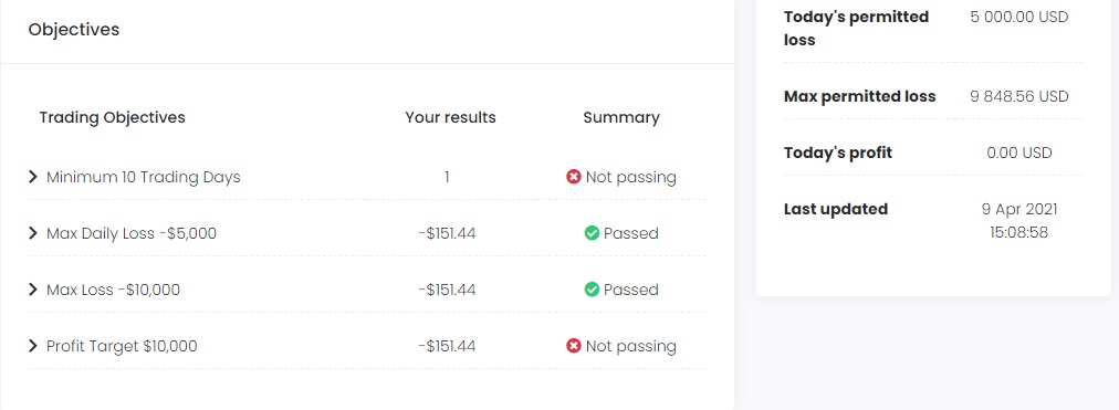 La 1ere étape est la plus difficile, il faut faire +10% avec un DD jour mieux que -5% et un DD max mieux que -10%, en 30 jours de temps, sinon les 540€ sont perdus et il faut recommencer.
