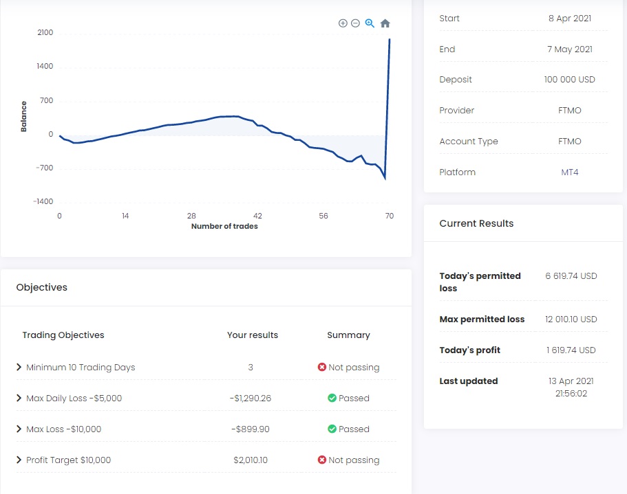 Si le target de +10% n'est pas atteint, lors du Challenge (et même lors de la vérification), FTMO offre un nouvel essai gratuit, si et seulement si, le compte est tout de même en positif, à la fin des 30 jours.