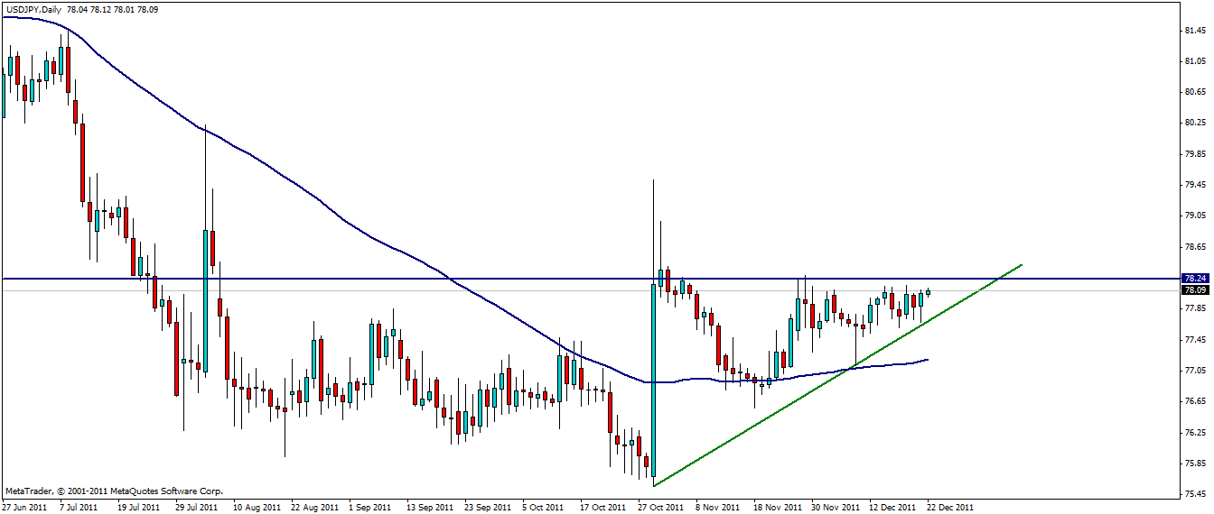 La paire évolue en tendance baissière depuis la fin 2006. Cependant lasse de voir sa devise s'apprécier face au dollar US la BoJ est intervenue à plusieurs reprises sur le marché des changes pour stopper cette appréciation du yen. Ainsi en données journalières a été efficacement coiffé par la MM70. Mais depuis le 31 octobre (intervention de la BoJ) la paire s'est affranchie de cette résistance devenue support.