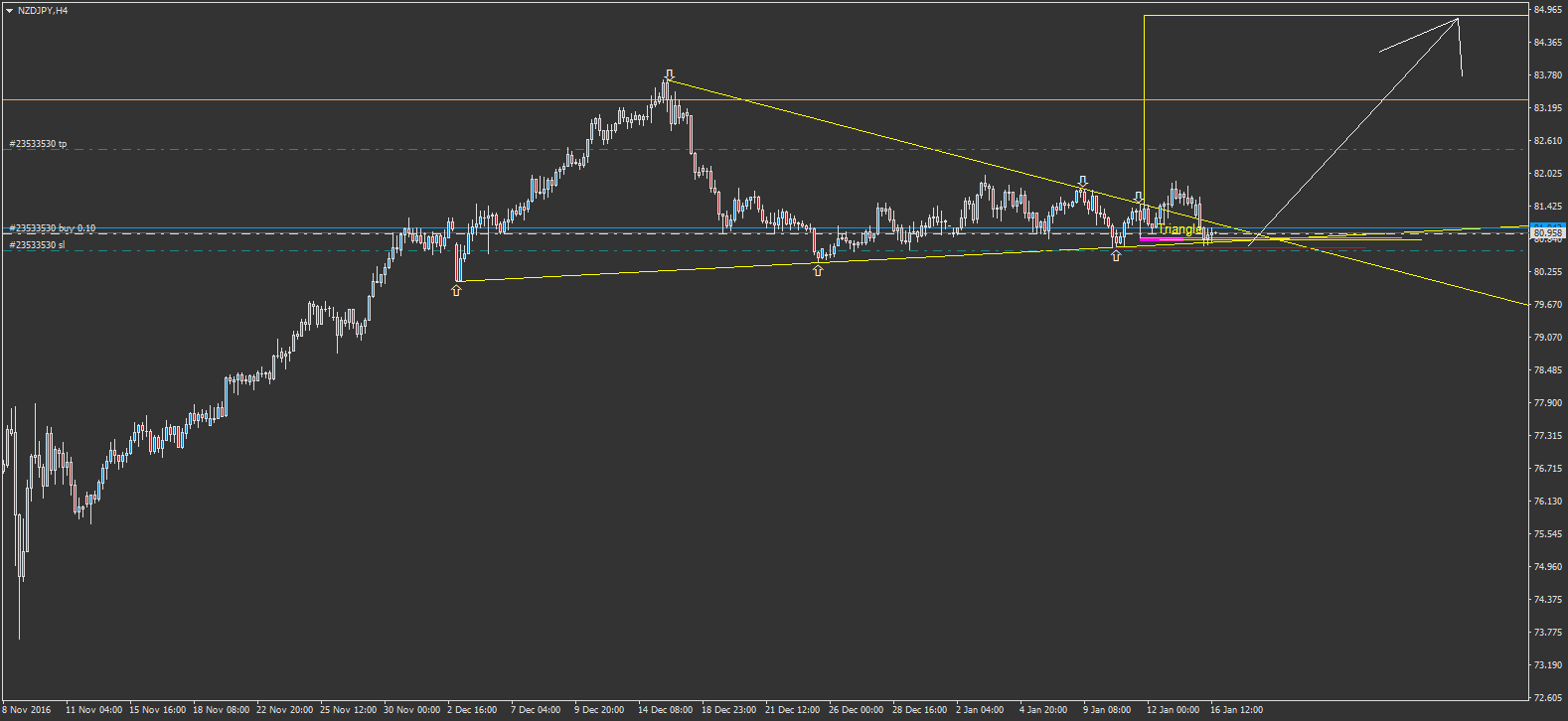 là je suis sur le NZDJPY toujours. le triangle d'origine (voir plus haut) était un triangle vert, ou j'ai obtenu un bon prix, mais, maintenant on à ce plus grand triangle jaune. reste à éspéré qu'il casse à la hausse sans que je ne soit stoppé. je garde l'objectif du triangle vert d'origine de ma position. si cette objectif est atteind, alors j'espèrerais un pullbck sur le triangle jaune pour rerentrer peut être à l'achat donc, mais cette fois ci avec l'objectif de ce triangle jaune.