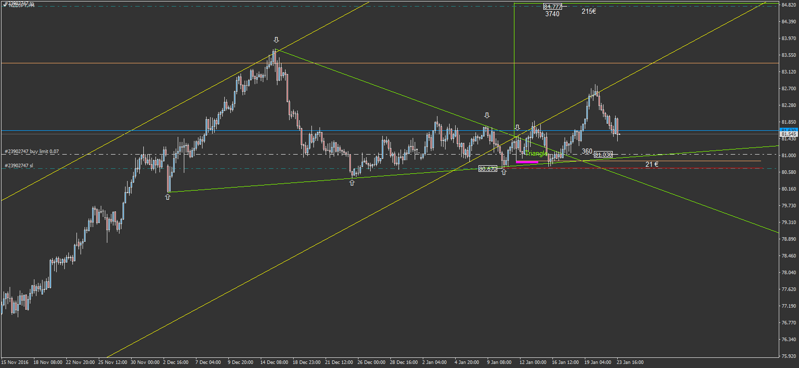 je pense que au dessus de 82, on aura encore une confirmation pour la hausse, comme on aura franchie le haut de la cassure du triangle jaune. moi je sortirais à 82.450, car je suis rentré en position pour un petit triangle. maintenant on a se triangle jaune qui donne un objectif bien plus haut et on risque d'hésité vers la ligne marron d'un enceint plus haut (83.342).