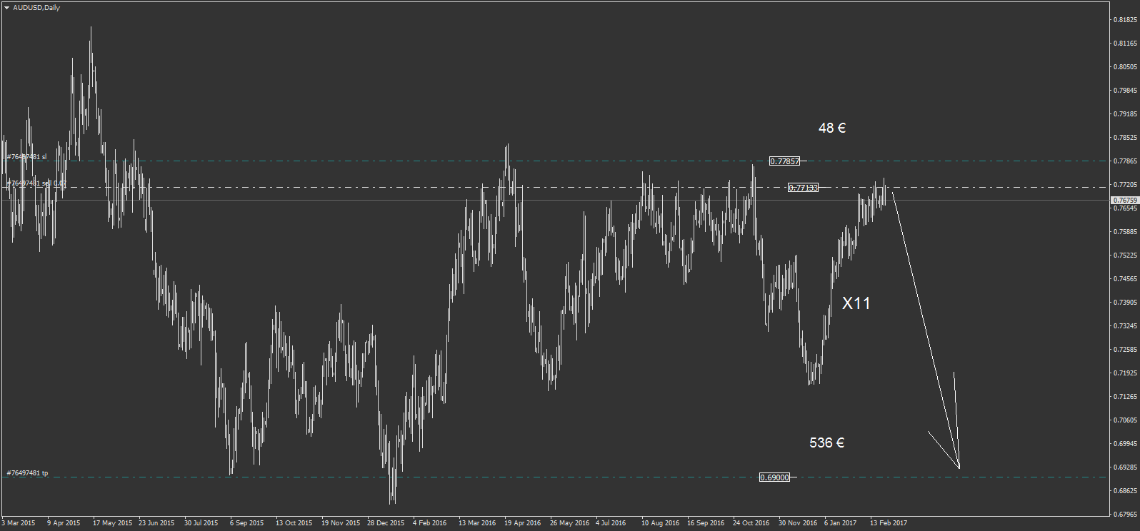 AUDUSD vendu à 0.77133 stop à 0.77857 objectif à 0.69000 je risque 48 € pour un objectif à 536 €