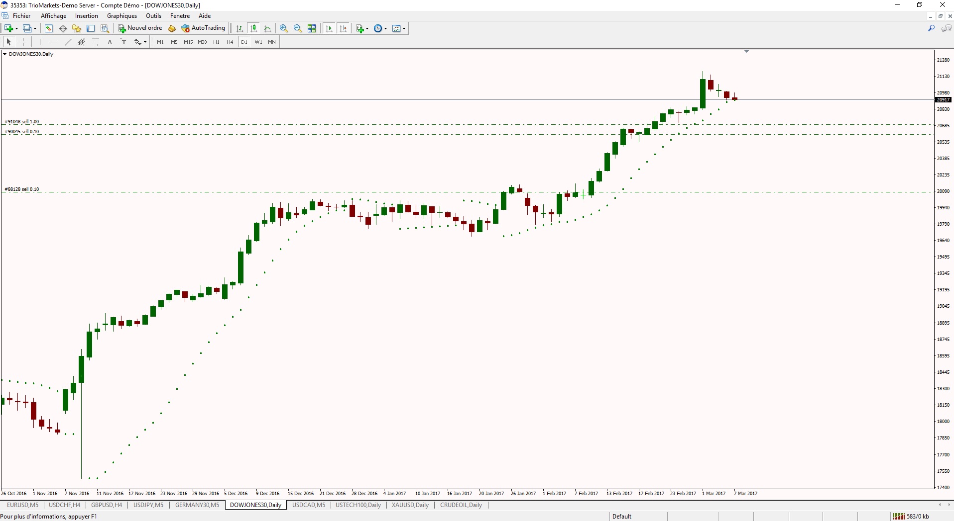 Sur le Dow Jones en journalier, on vient de le casser, ce qui signifie un signal baissier.