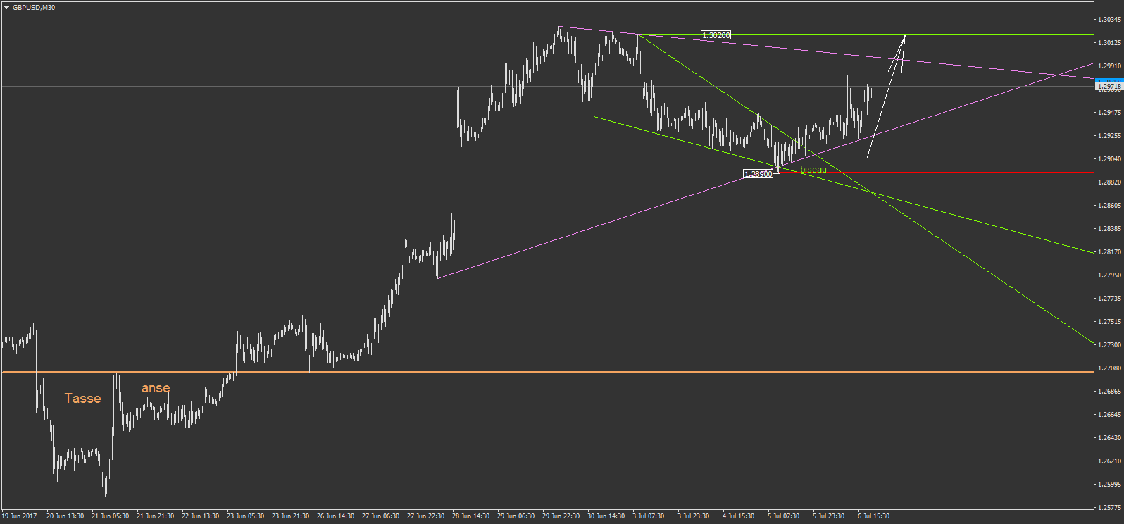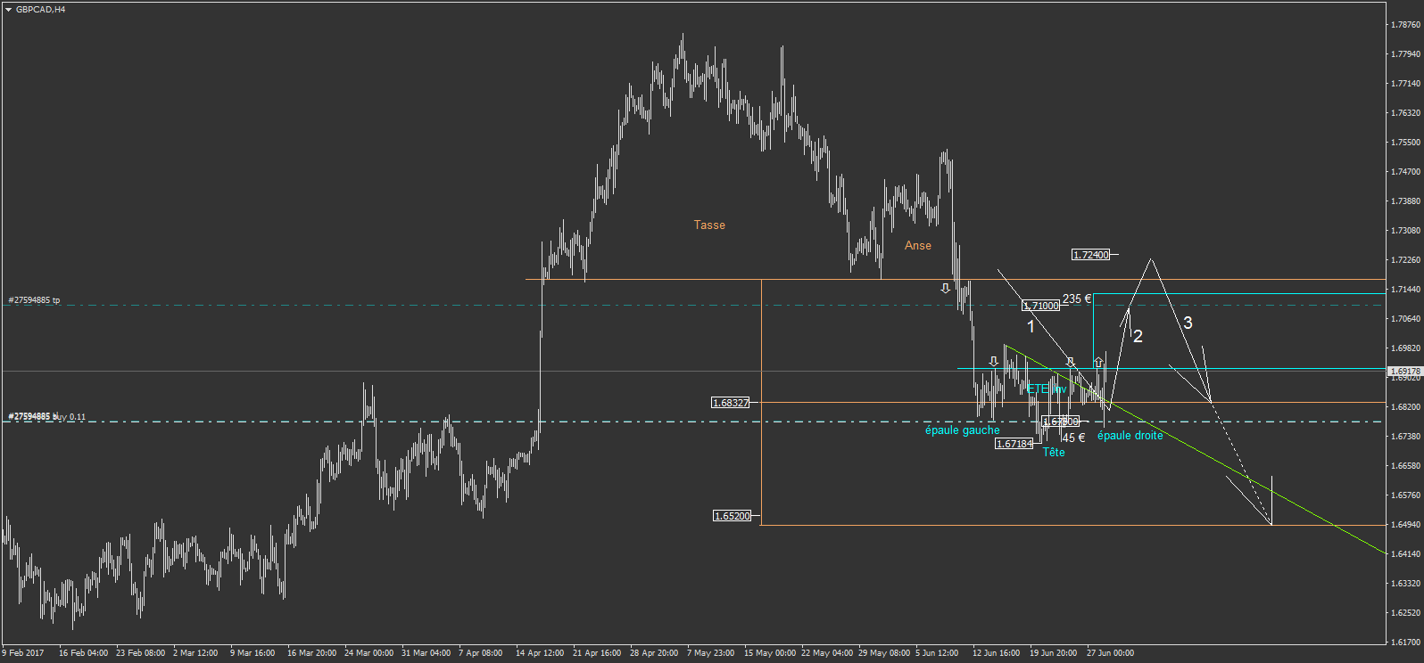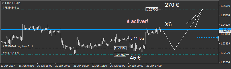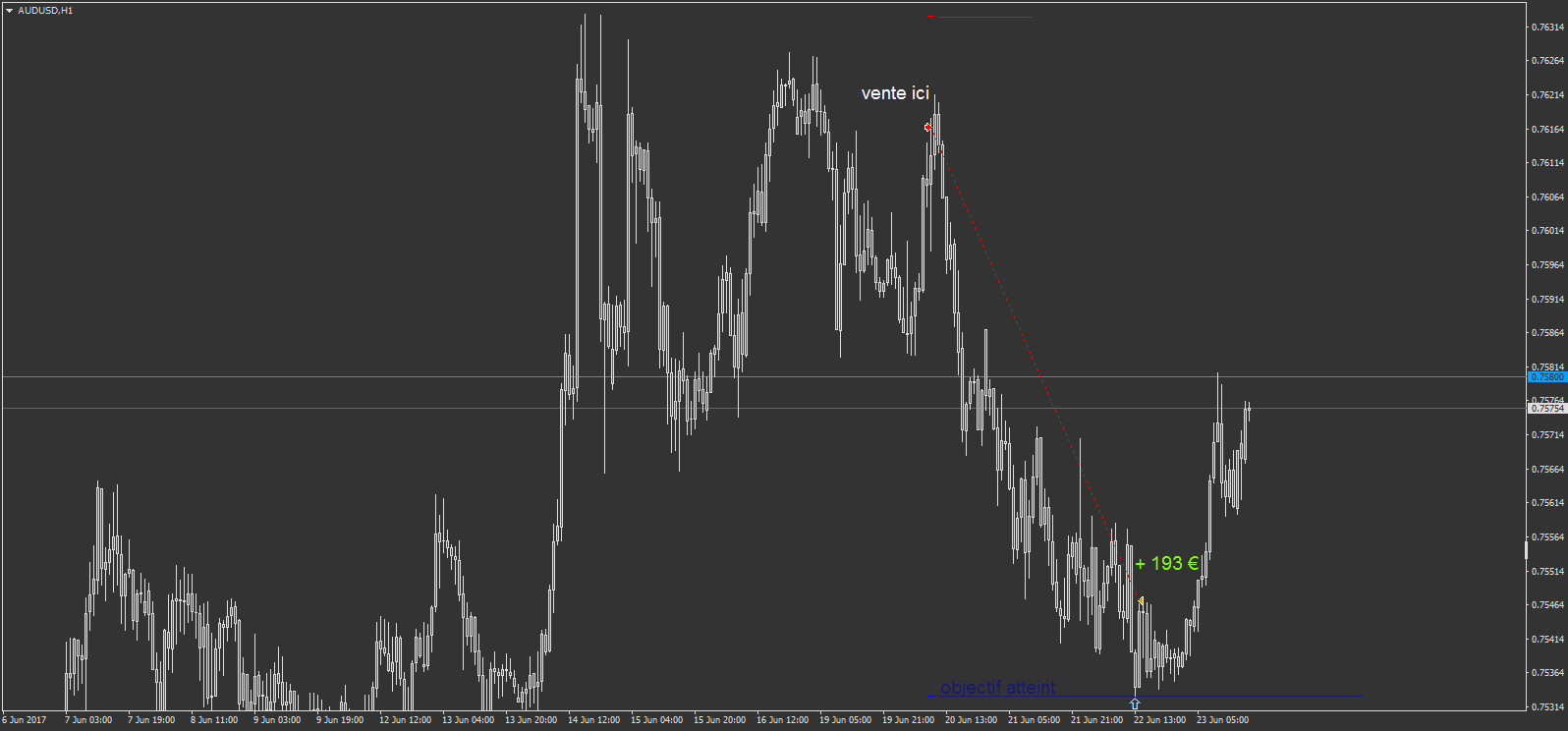 -sur le AUDUSD pour +193 € de gain. mon objectif initial était la ligne bleu foncé, mais je l'ai écourté après avoir anticipé avoir trouvé justement un point d'entré à l'achat sur ce niveau. mais je n'ai pas tenté ce point d'entré à l'achat...