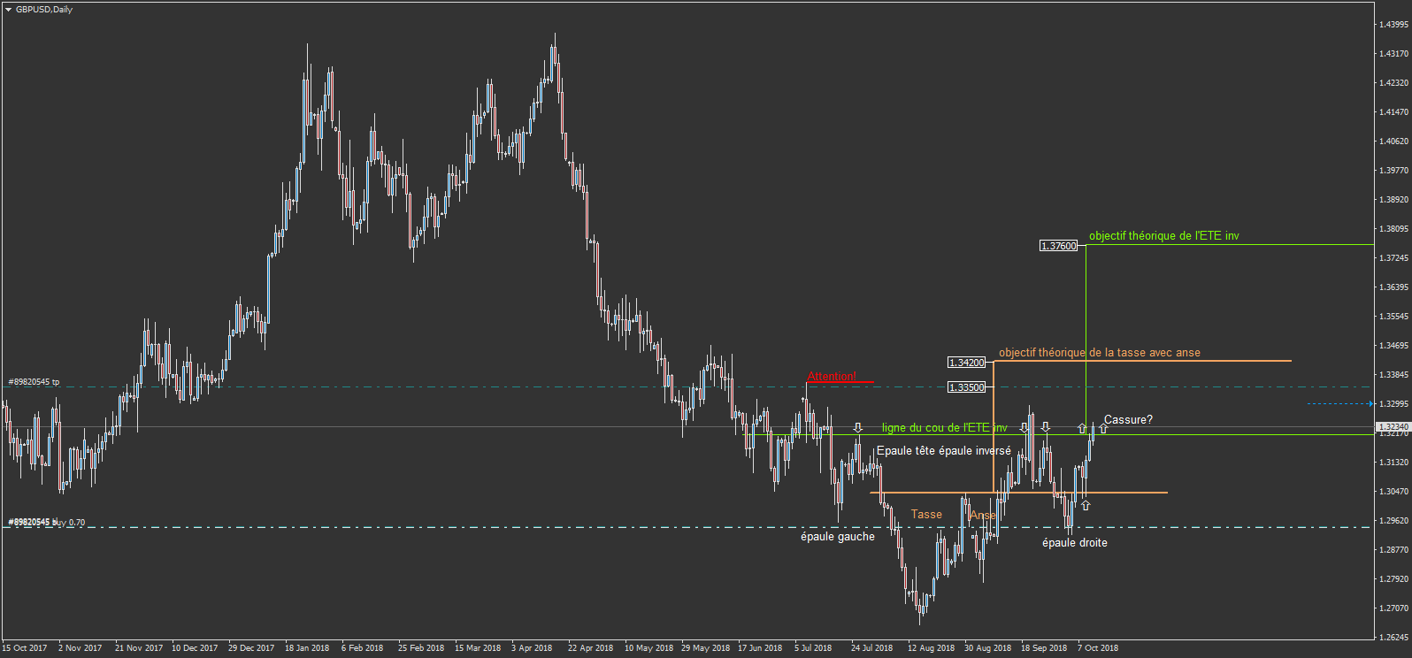 GBPUSD, ca progresse là aussi, et on vient de casser la ligne du cou d'une épaule tête épaule inversé, dont l'objectif théorique est bien plus haut que celui de la tasse avec anse.