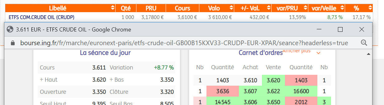ETF " USO" va tres mal " Initialement, la structure du fonds prévoyait d’acheter des contrats à terme dans le contrat mensuel le plus proche, en reconduisant au contrat du mois suivant deux semaines avant l’expiration. Mais au milieu de l'effondrement actuel du marché pétrolier, qui a vu les prix chuter à des creux records, le fonds a été contraint de modifier sa structure afin de limiter les pertes..." (prix négatif sur petrole -37$ hier) https://www.cnbc.com/2020/04/21 ...