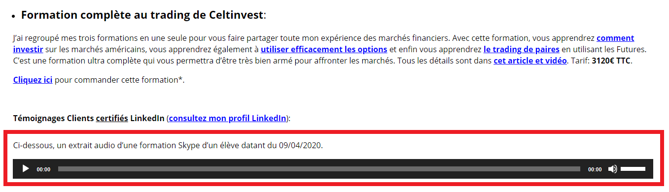 Vous pouvez retrouver un extrait d’une séance de formation par Skype en allant sur cette page : https://celtinvest.com/formation-trading/ et en scrollant jusqu’aux témoignages LinkedIn.