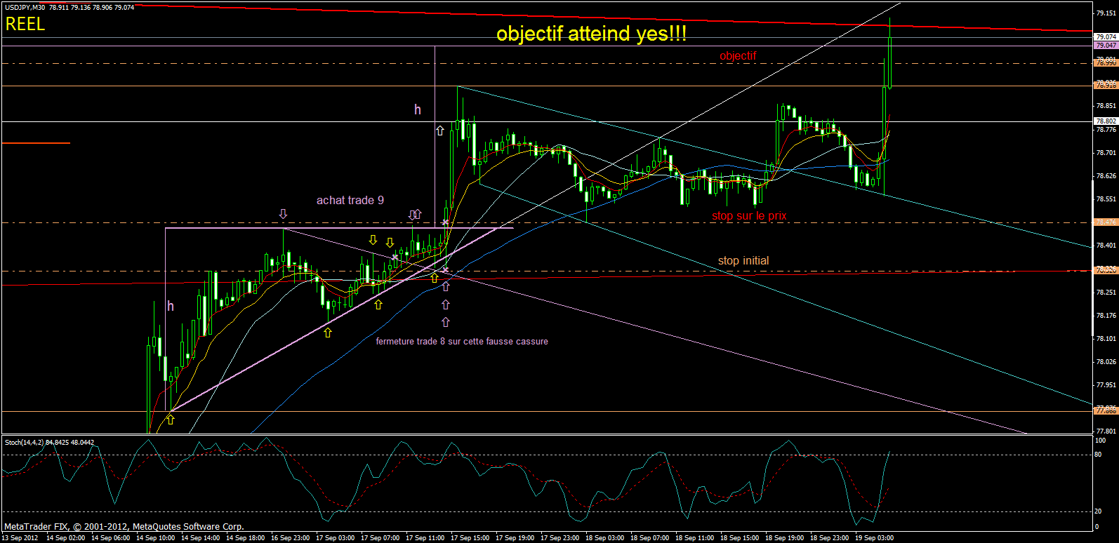 maintenant sur le jpy, je fait un nouveau teste, vous noterai que mon trade 8 à échoué, pusque je l'ai fermé suite a une fausse cassure du support, mais j'ai bien réspecté ma fermeture si le support ete cassé, pas de retard non plus donc super (sauf les 5 euro de perte ici). mais sur l'image qui suis, vous voyé mon trade9 avec intervention à nouveau sur le triangle qui cette fois si à fini je pense de ce former.pas de retard d'intervention. je ferai donc le bilan ds trade 7, 8 et 9 des que j'aurai finit le trade 9