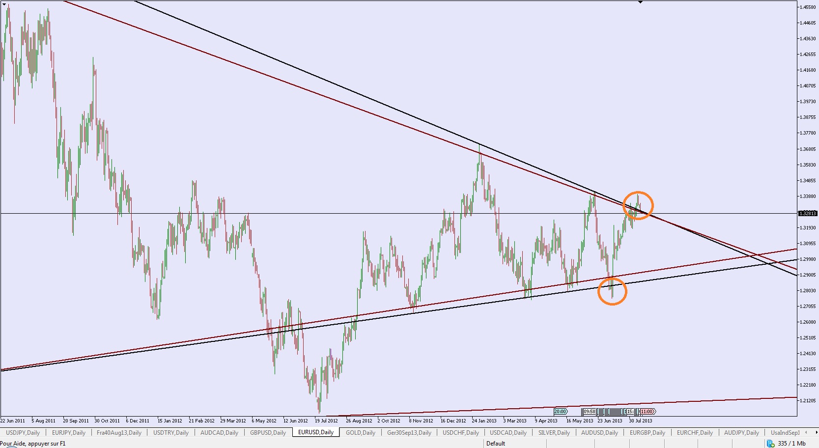 EUR/USD : sortie de triangle ? En pleine hésitation après un rallye haussier... (1) - 15/07/2013
