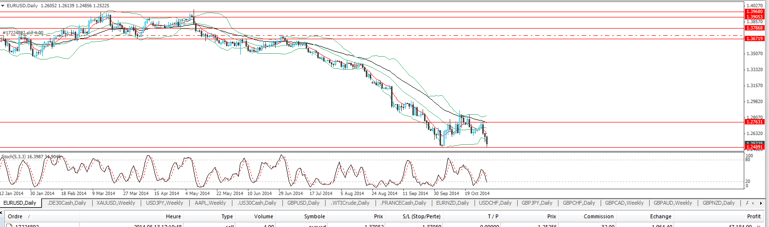 L'euro continue de se casser la gueule. Il y a encore de la marge. Je rappelle que nous sommes rentrez à la vente à 1.3705... en mai 2014. Nous sommes à 1.14 ce soir.