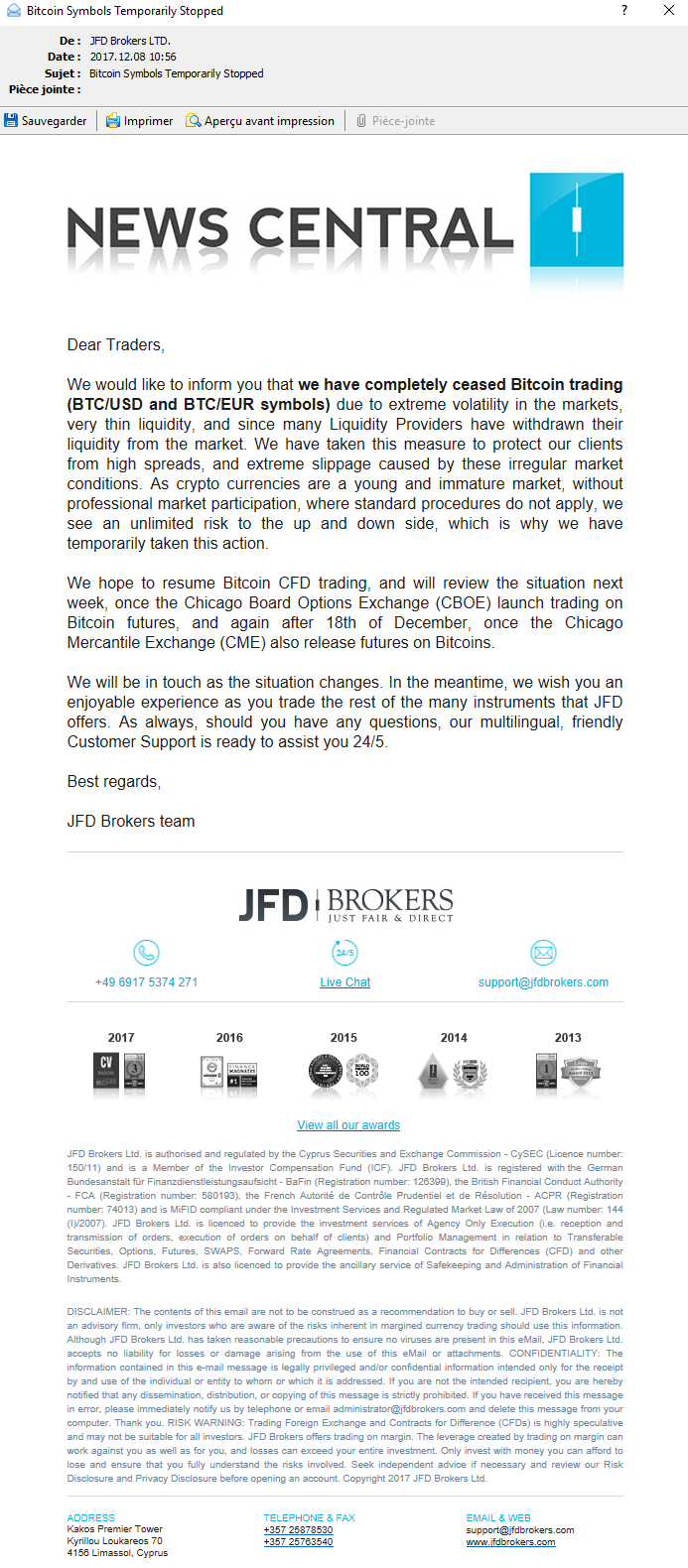 JFD Brokers a suspendu le trading sur le Bitcoin. Les clients qui ont déjà des positions ouvertes peuvent les fermer normalement, mais il n'est plus possible d'ouvrir de trades.