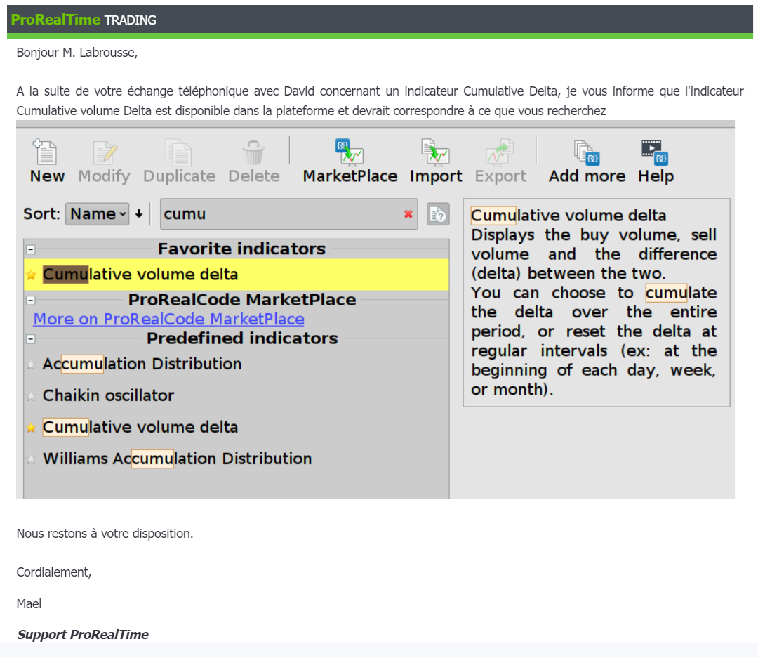 Suite au live avec Jean-Pascal Ferra "Volumes d'options par niveaux de prix - Call/Put Volume Pro" ProRealTime a ajouté l'indicateur Cumulative Volume Delta.