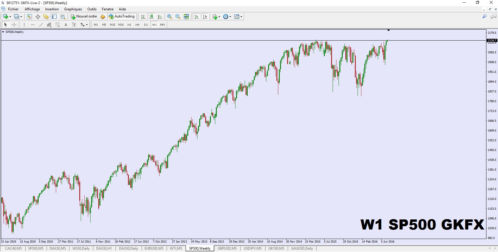 Suite aux bons chiffres relatif à l'emploi Américain de vendredi, le S&P 500 est en entré en impulsion haussière nous amenant sur les plus hauts historiques comme on peut le voir sur ce graphique hebdomadaire: