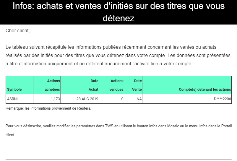 Voici le mail que j'ai reçu il y a quelques jours par rapport à ma position sur le titre Néerlandais ASR NL que je détient chez LYNX :