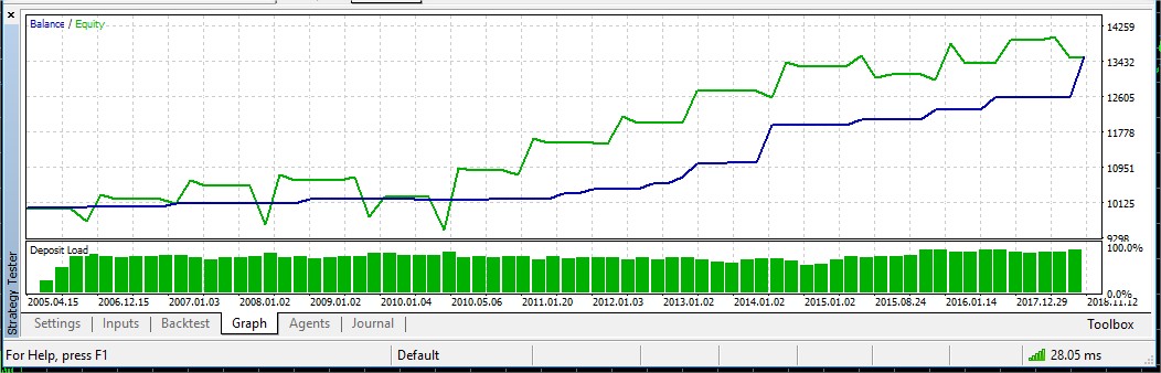 Bizarre on a pas les mêmes resultats +20% de 2005 à 2018 pour moi. Je te joins la config du StratTester en PJ.