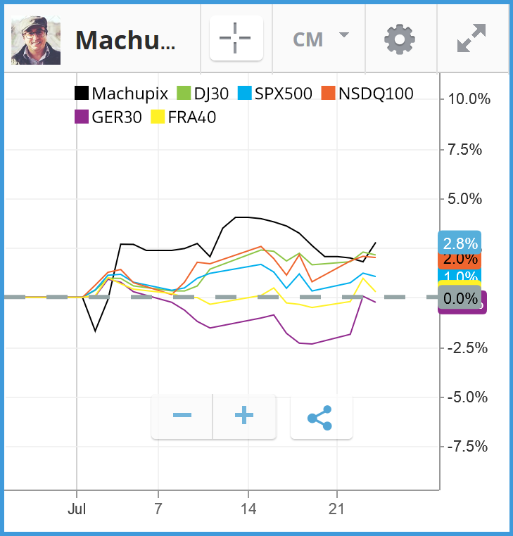 Juillet 2019 - Le portefeuille Machupi-X surperforme actuellement les principaux indices boursiers. Il reste 6 séances chargées en news.