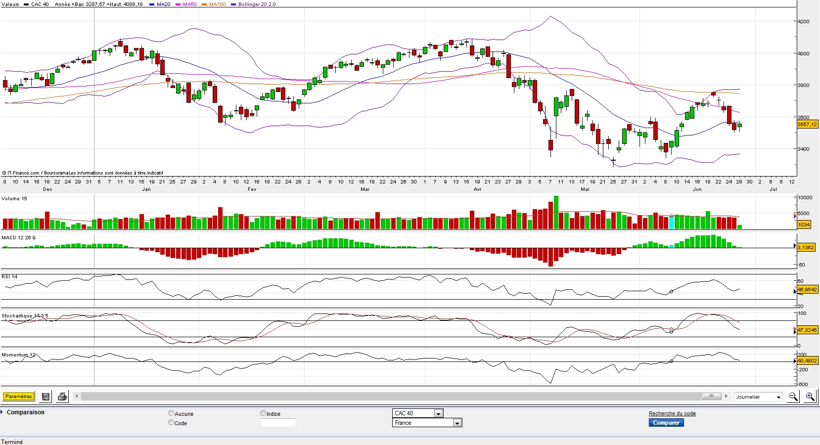 On marquerai alors un pic baissier qui nous permettrait de tracer une nouvelle trend line accompagnant le retracement de la crise et le prochain objectif haussier serait selon moi les 50% de retracement de la tendance baissière liée à la crise soit aux environs des 4300 points.