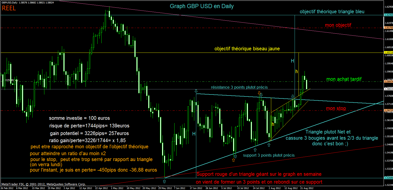 voici un trade que j'ai commencé hier. vous noterez mon erreur puisque je suis rentré en retard. par contre il s'agit d'un triangle bleu parfais et cassé juste avant les 2 tiers.voici 2 diapos pour bien voir le contexte. une diapo qui montre qu'on est en train de rebondir sur un support d'un énorme triangle visible en graph semain, et une diapo montrant mon trade l'objectif, le stop, le ratio rendement/risque.