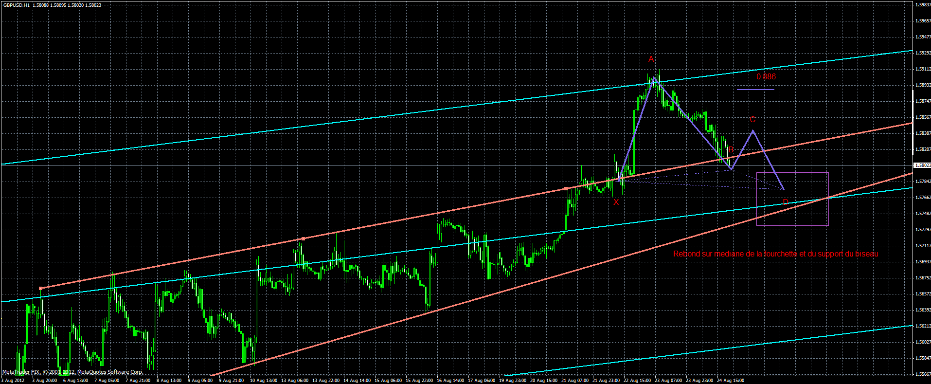 nous avons un butterfly pattern bullish en formation encore à confirmer (point D ) ce qui signifie que si la figure ce confirme en rebondissant sur le support de la fourchette couplé au bas de notre triangle que j'ai encadré on pourrai avoir une forte impulsion acheteuse.