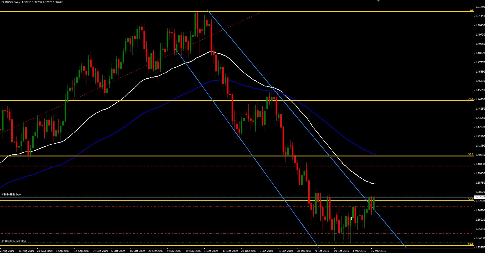 Analyse Graphique et Technique (avec un peu de fondamental tout de même) sur la paire de devises EURO / DOLLAR, sur une horizon de temps moyen terme, d'après une étude graphique en chandeliers japonnais journaliers, réalisée le 28/03/2010.