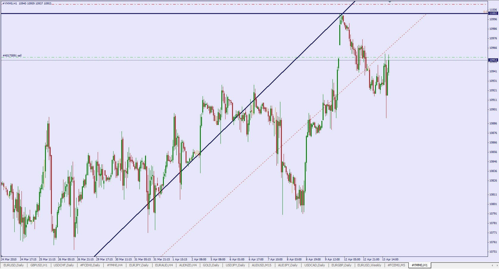 Je pense qu'on a eu une sortie à la hausse de la trade line baissière Moyen / Long Terme tracée en bleu, observé pendant la journée du 31/03/2010, puis une configuration de pull back s'est dessinée pour aller tester l'ancienne résistance oblique devenu support.