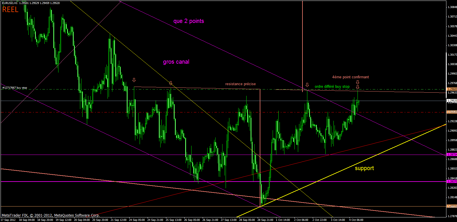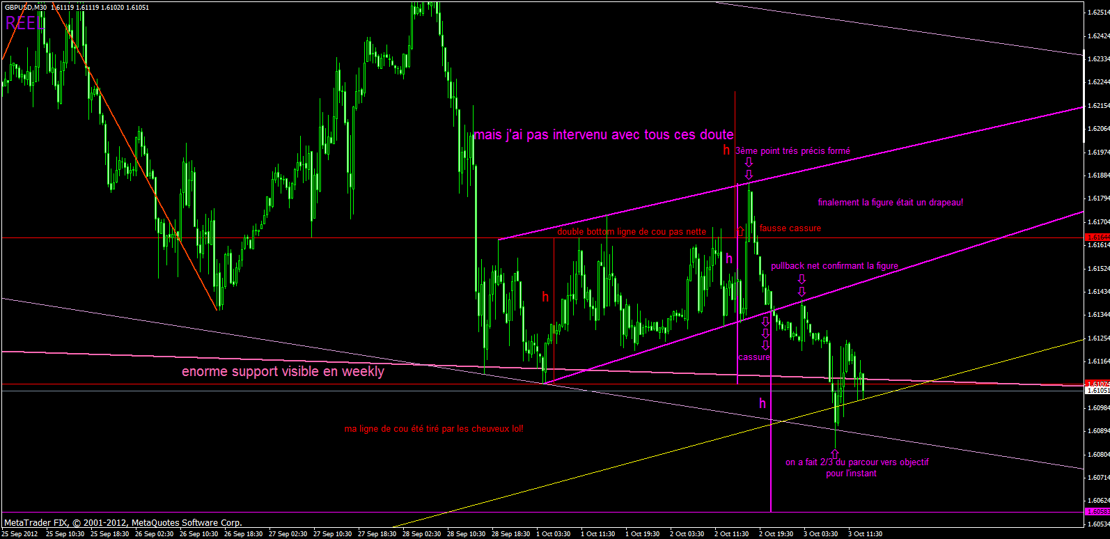 ta raison , meme si ca peu etre tentant de déplacer son stop, il faut pas le faire. moi par exemple, j'avait le meme stop que toi, et je l'ai laissé (des envie me disai de le bouger, mais j'ai pas pu le faire grace a mon tableau de rigeur yes!). par contre faut que je voix un truc , car sur mon trade, j'avait apres cou des doute sur la résistance qui venait d'etre cassé, et juste apres la cassure, on a précisé un troisieme point pour une résistance plus précise et meme d'une précision chirurgical. à ce moment là mon tableau disait ne ferme pas pour laisser le stop fermer et bien asumé le risque de dépard, mais mon tableau me disait aussi : si tu t'apercois que ta ligne de tendence , et donc ta figure n'était pas fini alors ferme sens hésité. j'ai remarqué la ligne de tendence, mais je n'est pas fermer. c'était dur de réagir en plus j'aurai rien perdu en fermant au momentou je m'en suis appercu. donc petite suptilité qu'on voi bien mieu en immage.c'est ce type de piege que je découvre depuis peu(par contre en suivant ma rigeur j'ai juste perdu ce ce que je devait perdre si ma figure était invalidé.