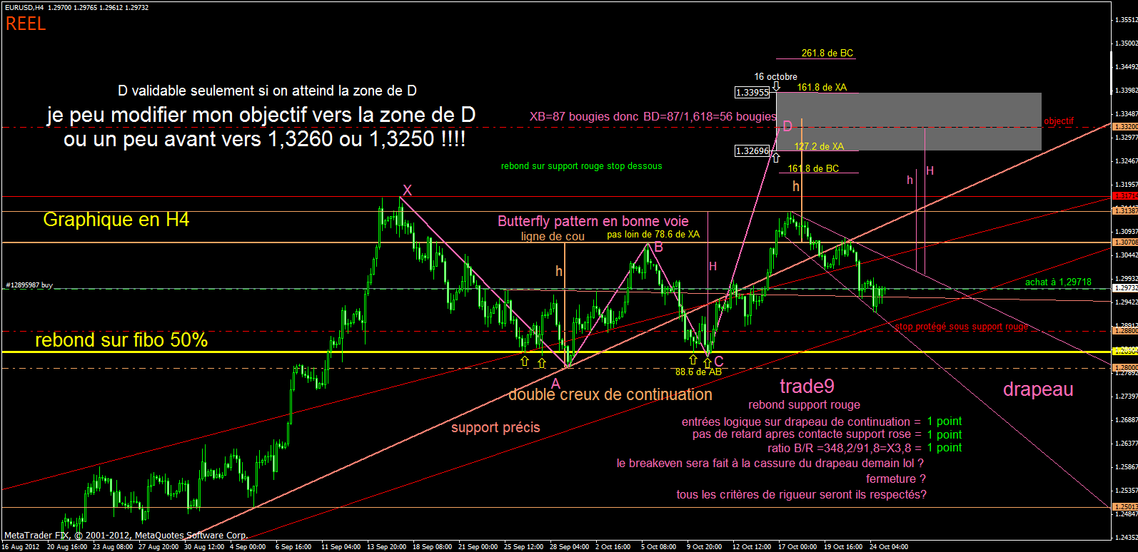 -sur le gbpusd cassure d'une figure qui repose sur un énorme support de drapeau. c'est une figure qui comme elle est cassé, me confirme le rebond sur le gros support mauve du drapeau daily. ouf là aussi j'ai pue faire le breakeven selon mes criteres.