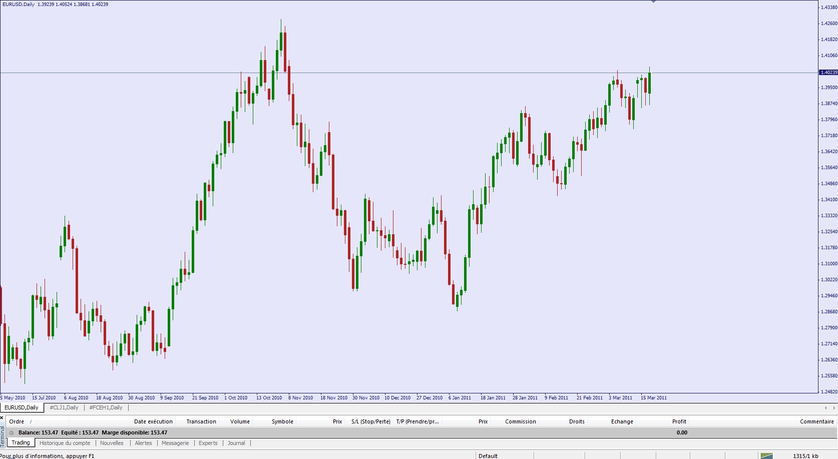 effectivement, on peut être acheteur sur l'EUR/USD d'autant plus que la resitance à 1.3990 à été franchis aujourd'hui, de plus si on trace la fibo du plus haut de 2008 jusqu'au plus bas de 2010, on se rend compte que la zone des 50 à été très legerement franchis et le RSI montre que ce sont les acheteurs qui on la main avec un cours qui evolue entre la mm20 et la bande supperieur de bollinger depuis le 23 fevrier.