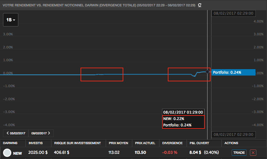 Bon j'ai réajusté mon investissement sur mon Darwin NEW pour rester dans un risque stable vu qu'actuellement Darwinex applique un levier de 1:6 entre mon compte et mon Darwin.