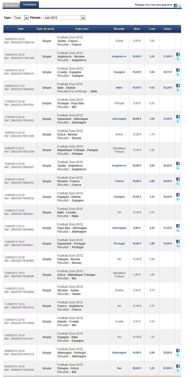 Je suis positif de 33€ depuis le début de l'Euro, avec 10 gains et 10 pertes et une cote moyenne de 2.17: