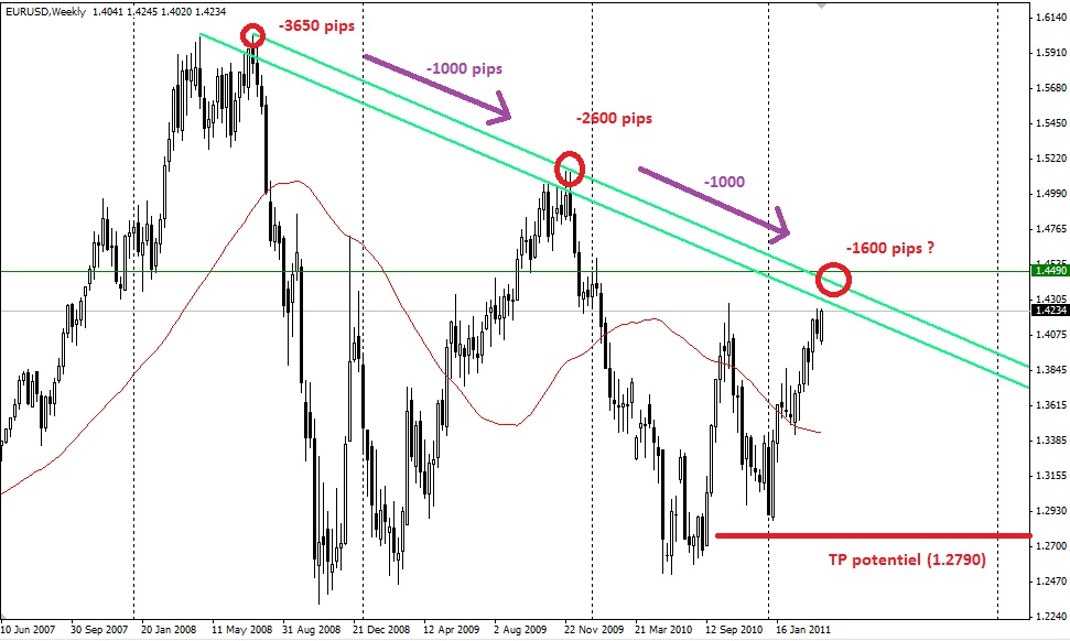 La parité EUR/USD a feinté hier une cassure haussière de 1,42.