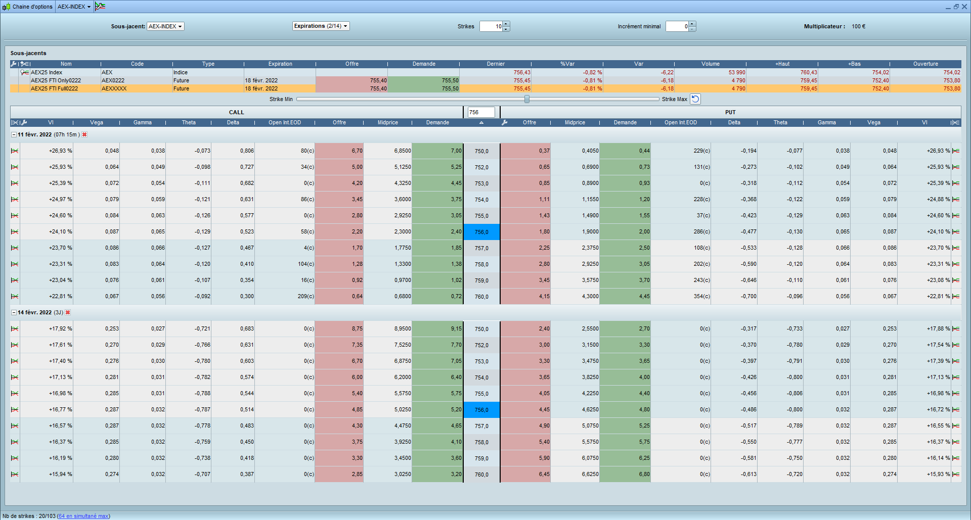 Je regarde les options quotidiennes sur l'AEX (indice Hollandais), notamment suite au webinaire avec Bertrand et Geert. Pour information, le code / ticker du future relatif à cet indice est FTI.