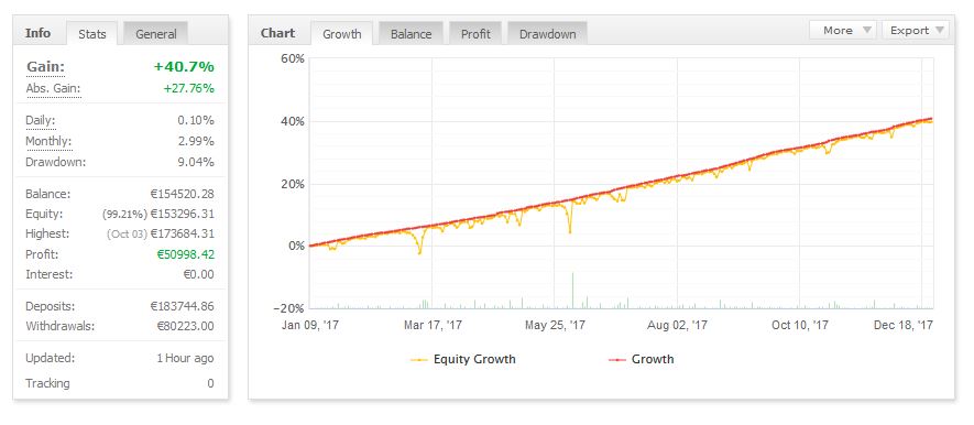 Affiche une performance de +197% avec un DD max de 30%, à noter que les gains sont réinvestis en permanence ceci expliquant la performance.