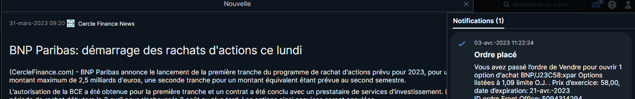 Vente d un call BNP ordre limit validité jour (prime 109 €) covered call