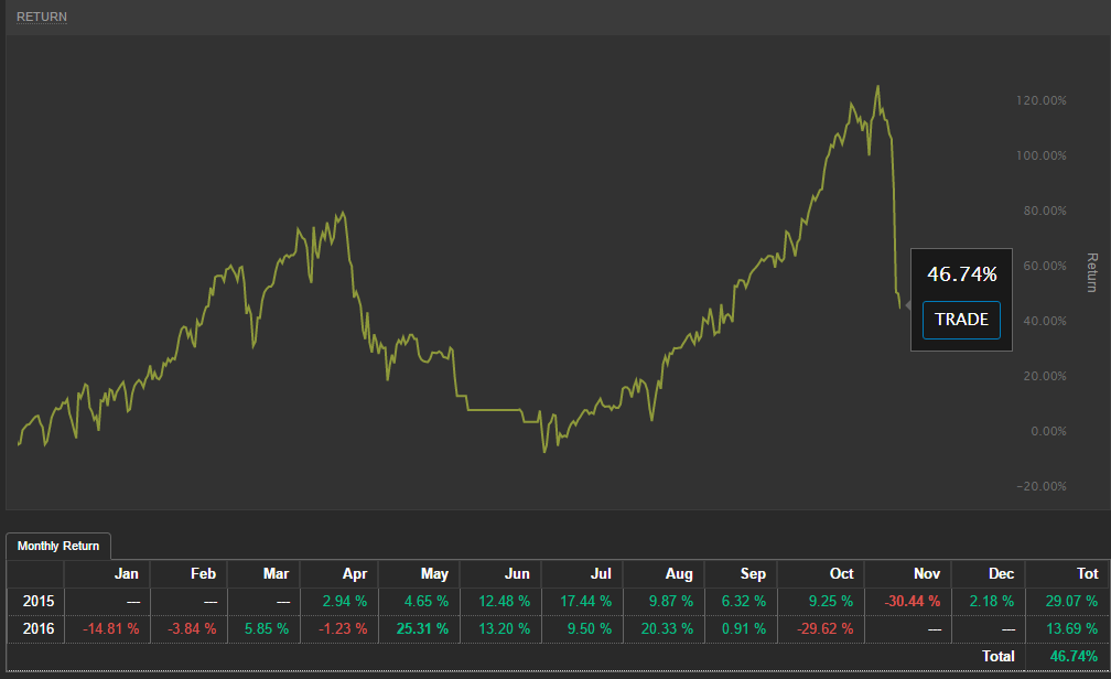 Exemple avec TSE. Le mec est perdant, certes. Mais en 2016, il se stabilise, perf de la stratégie: -2%. Perf du Darwin sur 2016: -33% ou comment transformer un mec flat en mec perdant.