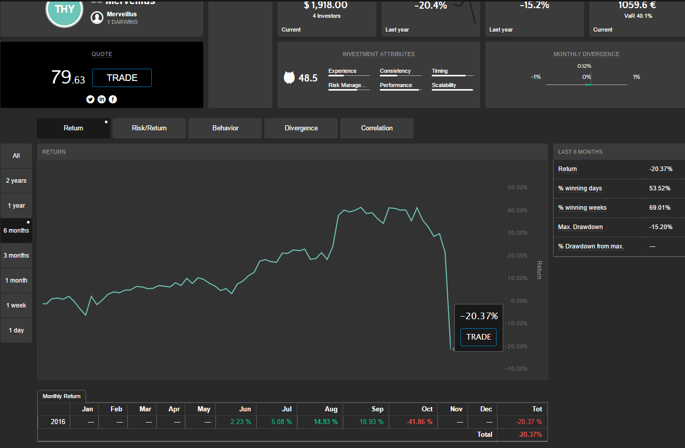 Exemple avec QAW. 1ere année de +120% avant de griller son compte en 2016 (stratégie) alors que le Darwin fait une bonne perf en 2015 pour subir une contreperformance en 2016 pour finalement faire -10% sur les deux ans (Darwin). Ou comment transformer un fou furieux en un mec "normal".