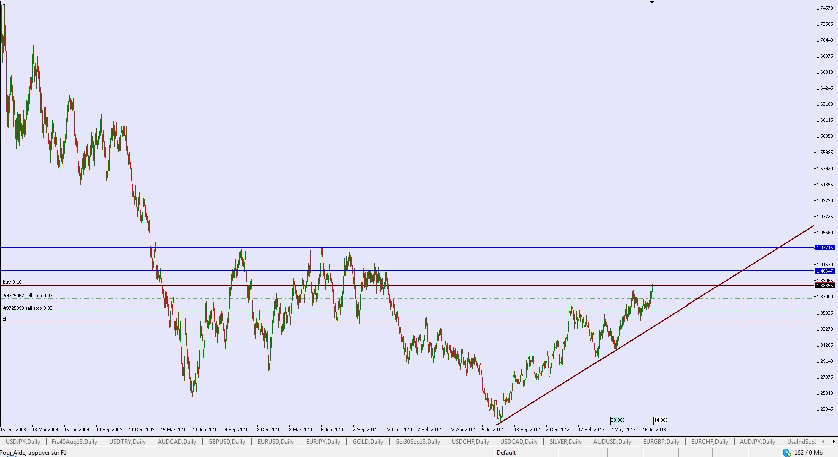 Oué moi je surveillerai et n'hésiterai pas à sortir si on a des signaux d'affaiblissement du mouvement haussier dans la zone qui s'étend de 1.4060 à 1.4371 que j'ai repéré via des plus hauts qui ont étés marqués en 2010 / 2011.