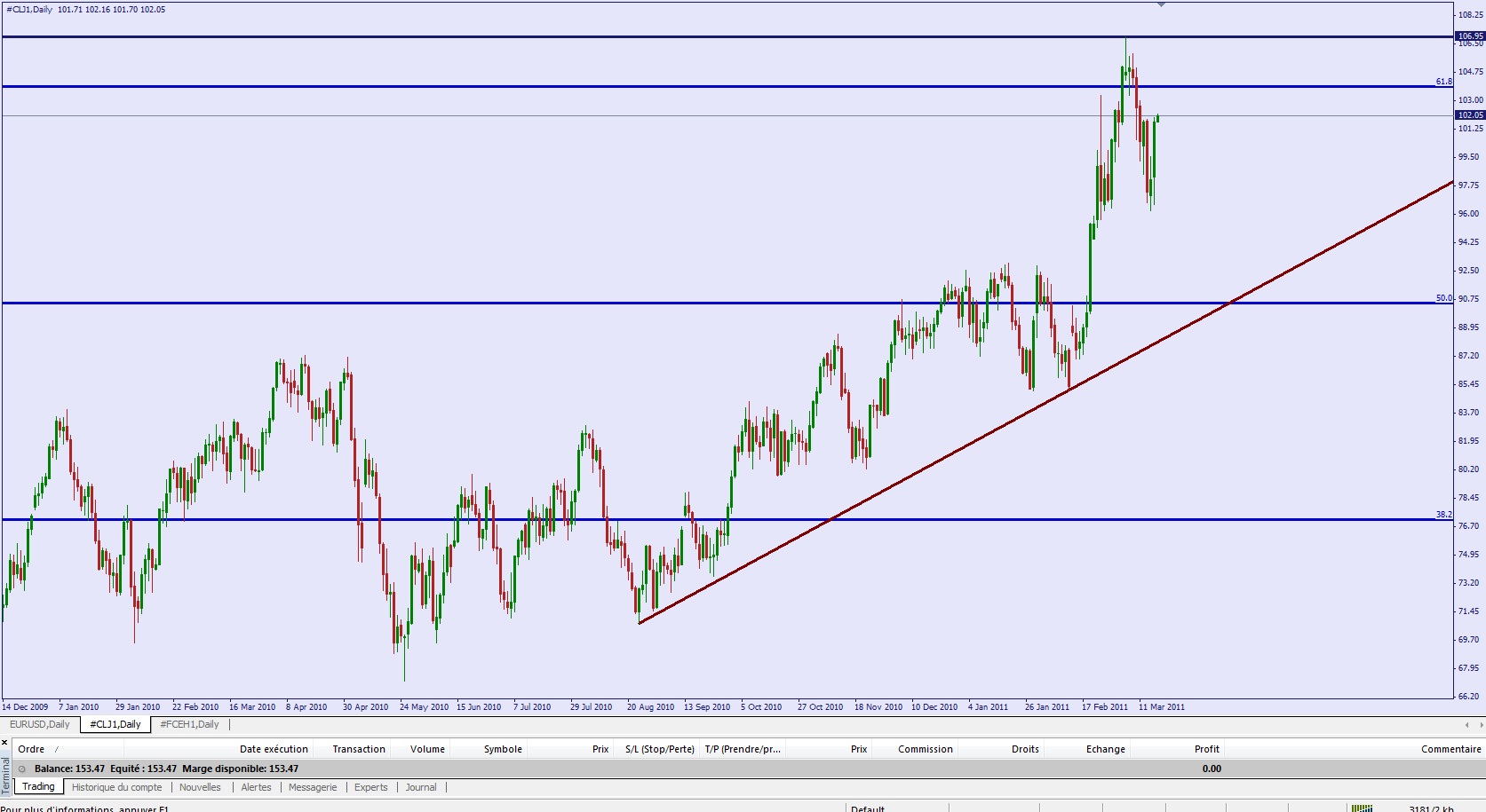 Soi on casse à la hausse la trend line baissière court terme et on repart à la hausse pourquoi pas vers de nouveaux plus hauts, soit on casse à la baisse le support oblique haussier long terme et on pourrait retracer facilement 38.2% voir 50% de la tendance observée depuis février 2009, soit un retour potentiel vers 75$.