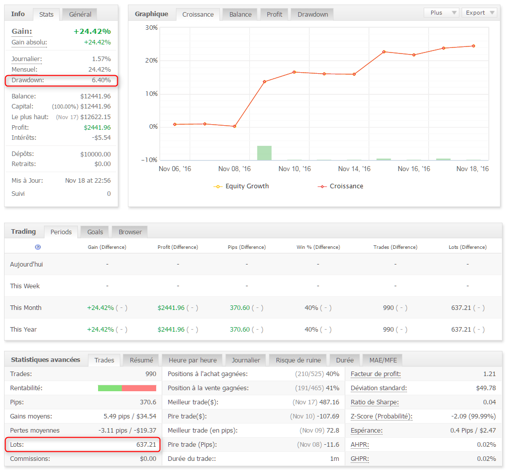 Les gains sont réinvestis automatiquement et le robot adapte automatiquement la taille de positions au capital réel (equity)