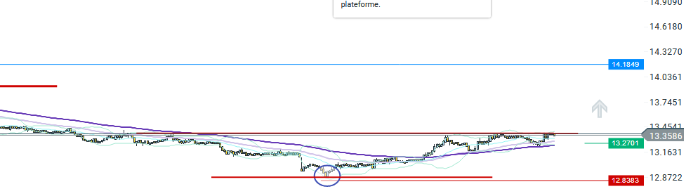 le cours vient toujours titiller le niveau des 13.4330 qui sert de résistance actuellement.