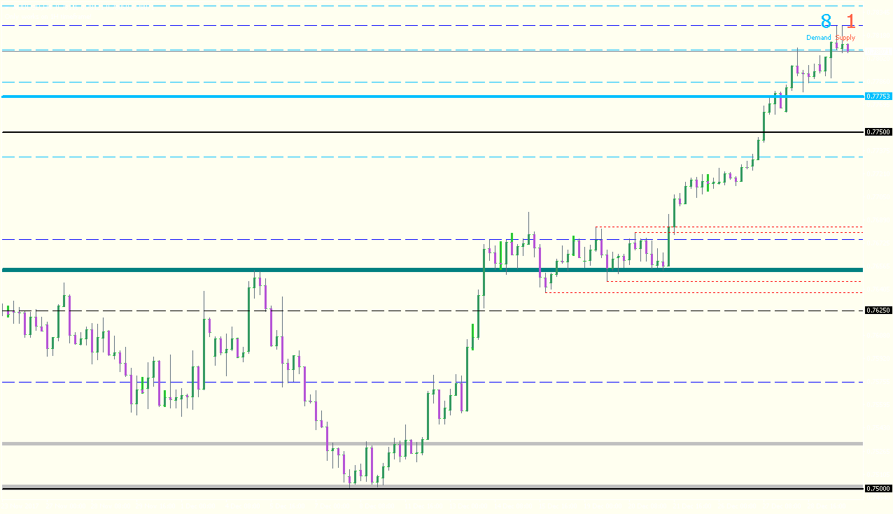 Je compte stopper les ordres en tout ou partie lors des touches de ses "barres" horizontales. Et suivre le supply demand comme un trailing stop, puisque celui ci suit le prix, rétrécie et s' élargie en fonction des "noeuds" que le prix a formé par la passé.