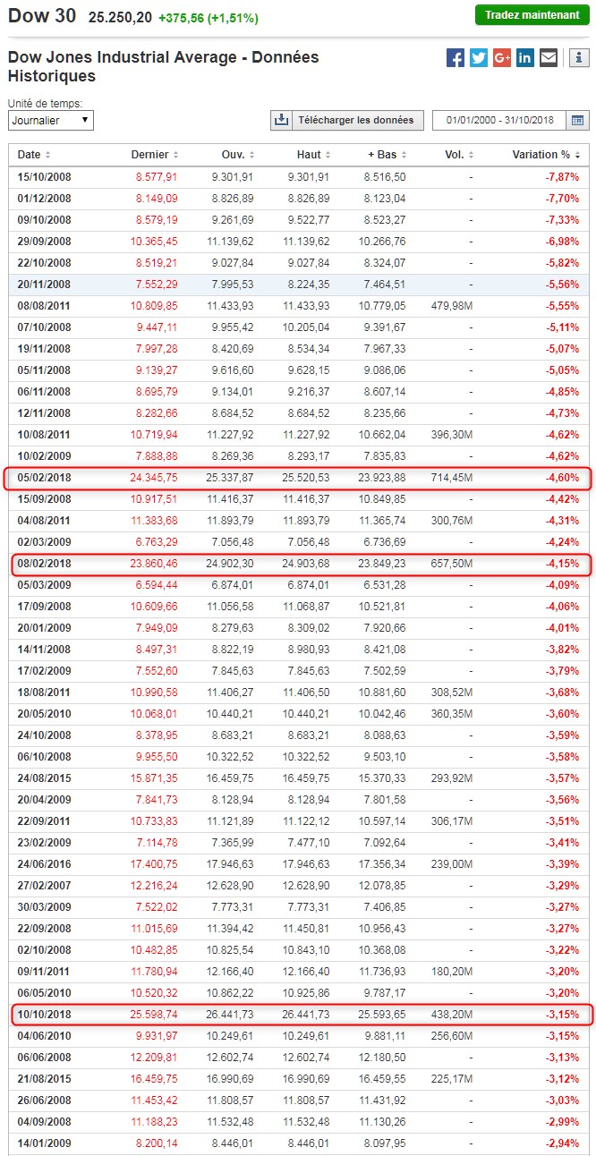 quand on regarde les plus mauvaises séances depuis 2000 sur le DOWJONES, on voit qu'il y en a une dizaine de -5% à -7,87%, principalement concentrée en 2008. Et la plus mauvaise est à -7,87%.