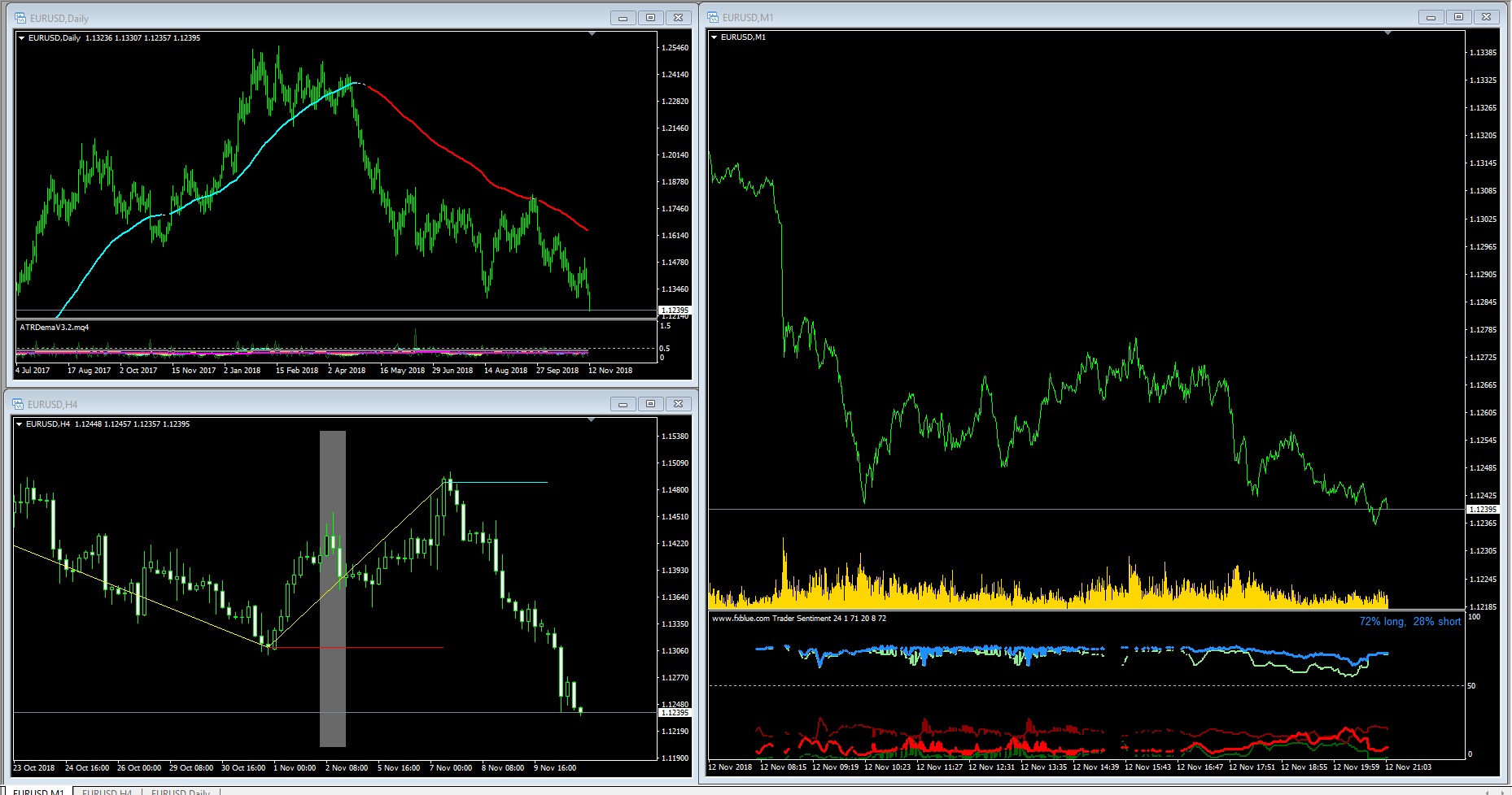 Pour en revenir au suspense, la nuit va être chaude : Le daily montre l'enfoncement d'un support. Le H4 montre une tendance en ligne down (tout droit sans zigzag - une des rares figure où l'adage selon lequel la tendance est ton amie fonctionne sérieusement). Le M1 montre l'attaque répétée du support. Une fois passé, soit ça pull back et ça break, soit ça réintègre.