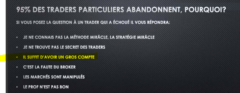 A coté de mon compte future ( pour le scalping) j ai aussi des comptes bourse ou je detient des actions comme Orange et je n'est pas de levier sur ces comptes actions.Donc mes stops sont bien plus large bien sur que sur mon compte future .Donc pour répondre a votre question Stéphane il faut prendre en considération quel type de trading ( scalping,intraday,swing) , quel type d 'actif et la volatilité de l 'actif ( si j 'achète du Orange ce n'est pas pareil que du Tesla par exemple).Et je réaffirme pour répondre a celui qui ma traité de monsieur je sais tout puis de "Flambeur" sur Youtube ( il a beaucoup d 'abonnés) que faire un dépot de 5000$ et payer un flux ( frais futures)de 50$ par mois et prendre une plateforme comme Jigsaw 500$ puis l' abonnement de 50$ par mois pour au final ne trader que avec des micros lot ( 0.50 cts le point, marge 50 $ jour) que c 'est absurde et ridicule d 'affirmer haut et fort ( puisque il fait une vidéo rien que sur ça) pour dire que au final le scalping ce n 'est pas rentable!C 'est comme s 'équiper pour escalader le Mont Blanc et au final gravir que la Butte Montmartre.