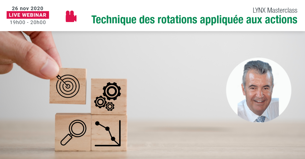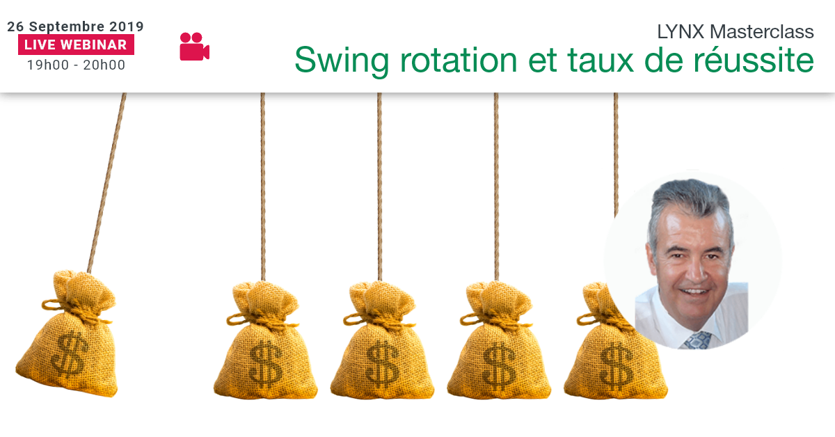 Dans ce webinaire LYNX Masterclass animé par Pascal TRICHET, nous aborderons les techniques de rotation et les opportunités liés au swing trading. Nous verrons lesquelles offrent la plus grande probabilité de réussite, et surtout comment les utiliser. Chaque mois, nous passerons en revue les conseils du mois précédent pour vous offrir le meilleur suivi.