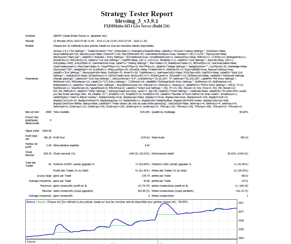 Peux-tu faire un essai identique avec EURUSD et GBPUSD? Merci. (c'est bien Blessing v3.9.1 sans martingale ?)xgiles a écrit :je publierai volontiers mes baktest. Voici mon premier (Balance en pièce jointes) USD/JPY du 03/01/10 au 3/12/10 UT H1 Profit factor 2.36 (Chut maximal 1696$ c'est bien ça qu'on appelle le Drawn Down?)