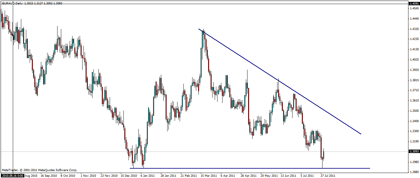 Comme vous pouvez le noter sur ce graphique en hebdomadaire, l'euro n'a cessé de se déprécier face au dollar australien depuis 2008.