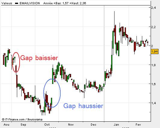 La formation d’un gap peut résulter de l’annonce d’un événement majeur concernant le titre ou d’un marché peu liquide.