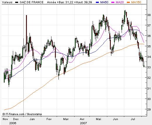 La moyenne mobile peut être calculée sur n’importe quel horizon de temps, puis ce qu’il ne s’agit en faite que de faire une moyenne des cours précédents. Par exemple si vous prenez la moyenne mobile de l’action GDF sous 50 jours (MA 50, en orange sur le graphique) cela représente le cours moyen des 50 dernières séances de bourse.